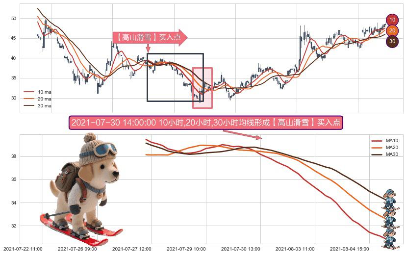 形态多维评估: ⚀ 2021-07-27 11:00:00小时-2021-08-05 11:00:00小时显现 10小时-20小时-30小时均线 【高山滑雪】买入点 看多信号,后市看涨,买入
