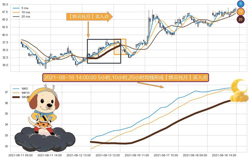形态多维评估: ⚀ 2021-08-12 13:00:00小时-2021-08-18 14:00:00小时显现 5小时-10小时-20小时均线 【烘云托月】买入点 看多信号,后市看涨,买入