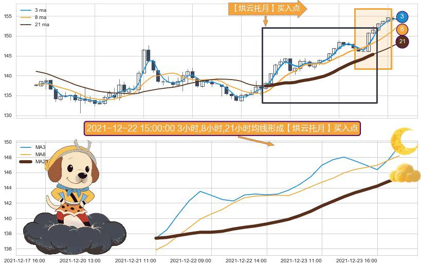 形态多维评估: ⚀ 2021-12-21 11:00:00小时-2021-12-27 10:00:00小时显现 3小时-8小时-21小时均线 【烘云托月】买入点 看多信号,后市看涨,买入