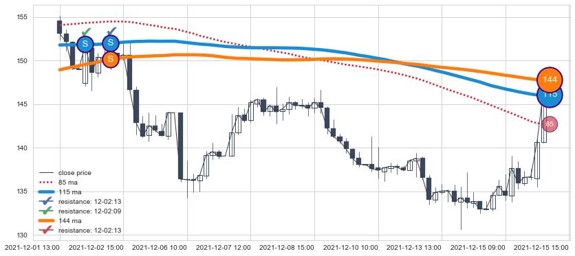下跌趋势12-01 13:00-12-15 15:00,均线144, 115确认关键阻力2处