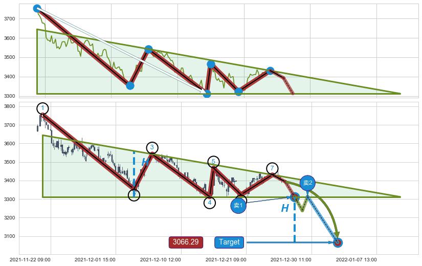 ➣ 最小中继整理跌幅→𝐇: 246.63 (下侧直角边第一支撑点②与斜边垂直距离)