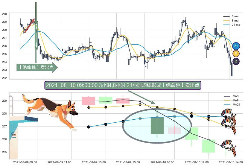 ⚀ 2021-08-10 09:00:00小时显现 3小时-8小时-21小时均线 【绝命跳】卖出点 看空信号,后市看跌,卖出