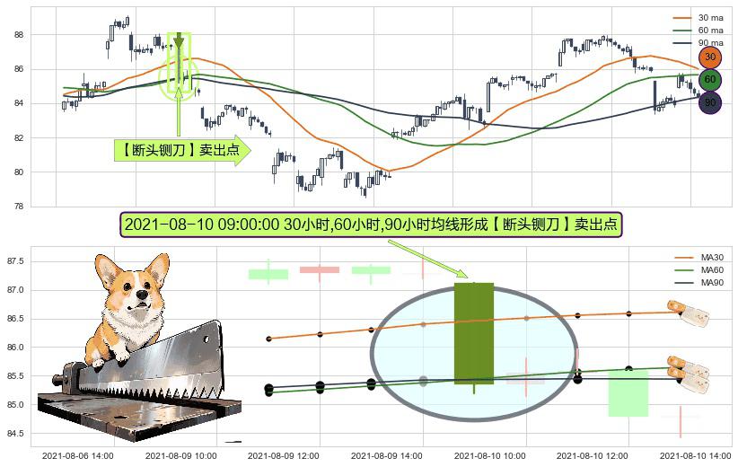 形态多维评估: ⚀ 2021-08-10 09:00:00小时显现 30小时-60小时-90小时均线 【断头铡刀】卖出点 看空信号,后市看跌,卖出