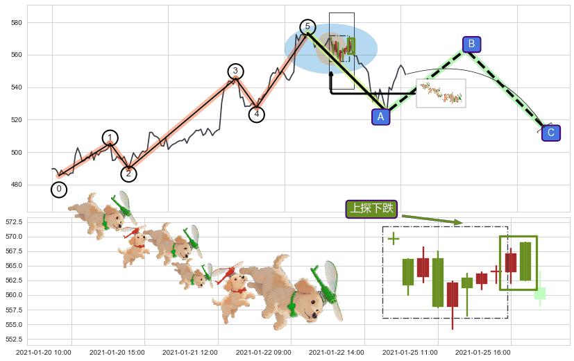 从2021-01-21 14:00至2021-01-22 15:00,共包含10个小时,阶段股价下跌-0.56%,阶段股价变动位移路程比: 1 : 6