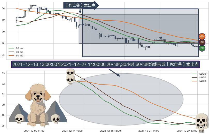 形态多维评估: ⚀ 2021-12-13 14:00:00-小时至2021-12-27 14:00:00-小时显现 20小时-30小时-60小时均线 【死亡谷】卖出点 看空信号,后市看跌,卖出