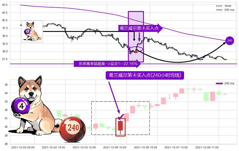 形态多维评估: ⚀ 2021-12-06 09:00:00-小时显现 葛兰威尔均线 240小时均线 第④买入点 下降趋势均值回复的短线反弹信号,后市看涨,买进信号