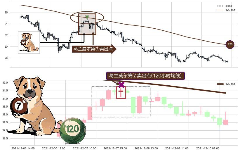 形态多维评估: ⚀ 2021-12-07 14:00:00-小时显现 葛兰威尔均线 120小时均线 第⑦卖出点 下降趋势的中继信号,后市看跌,卖出信号
