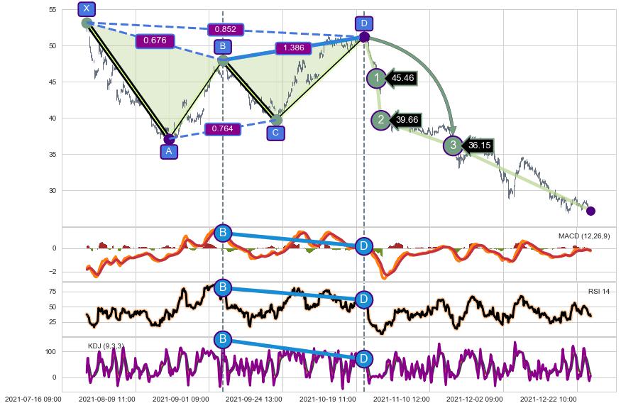 ➢ 谐波价格D点比B点高 ⤴,【KDJ】指标D点比B点低 ⤵️