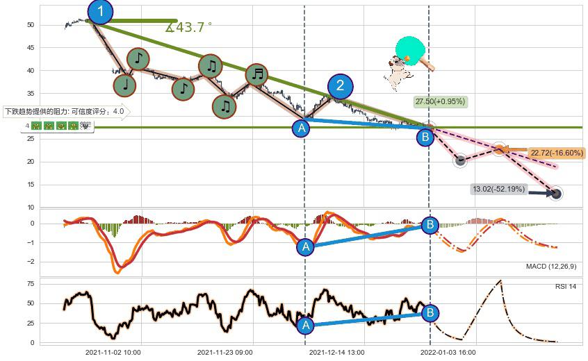 ♘ 在最后的下跌阶段2021-10-21 10:00至2021-12-27 15:00,存在 持续未破位的阻力位 ,阻力价格27.50,可信任强度85.80%,其距离最后价格27.24相差 +0.95%