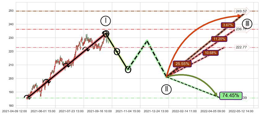 ➢ 循环浪继续向上【最高】位置(05-12:14, 249.57),匹配聚类样本比例14.35%, 可能性概率3.67%