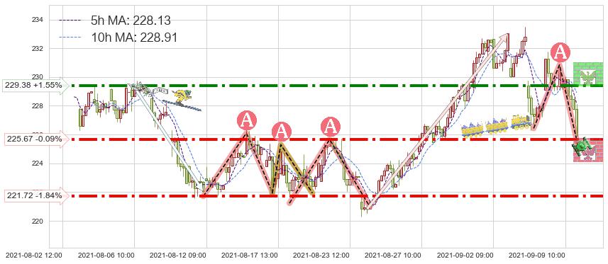 ♘ 阻力价格位229.38,可信任强度82.43%,距离最后交易2021-09-09 14:00形成的收盘价格225.88相差 +1.55%
