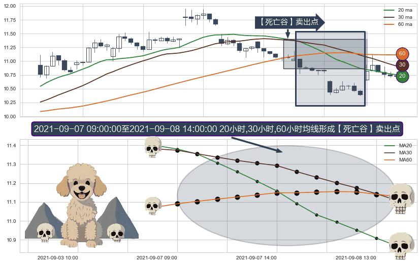 ⚀ 2021-09-07 10:00:00-小时至2021-09-08 14:00:00-小时显现 20小时-30小时-60小时均线 【死亡谷】卖出点 看空信号,后市看跌,卖出