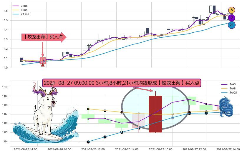 形态多维评估: ⚀ 2021-08-27 09:00:00小时显现 3小时-8小时-21小时均线 【蛟龙出海】买入点 看多信号,后市看涨,买入