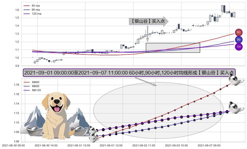 形态多维评估: ⚀ 2021-09-01 10:00:00-小时至2021-09-07 11:00:00-小时显现 60小时-90小时-120小时均线 【银山谷】买入点 看多信号,后市看涨,买入