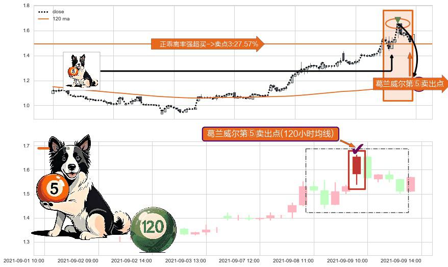 形态多维评估: ⚀ 2021-09-09 09:00:00-小时显现 葛兰威尔均线 120小时均线 第⑤卖出点 上升趋势均值回复的短线回落信号,后市看跌,卖出信号