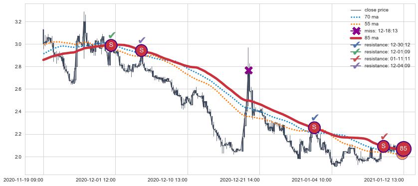下跌趋势11-19 09:00-01-12 13:00,均线85确认关键阻力4处