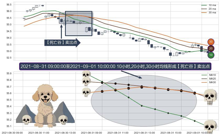 形态多维评估: ⚀ 2021-08-31 10:00:00-小时至2021-09-01 10:00:00-小时显现 10小时-20小时-30小时均线 【死亡谷】卖出点 看空信号,后市看跌,卖出