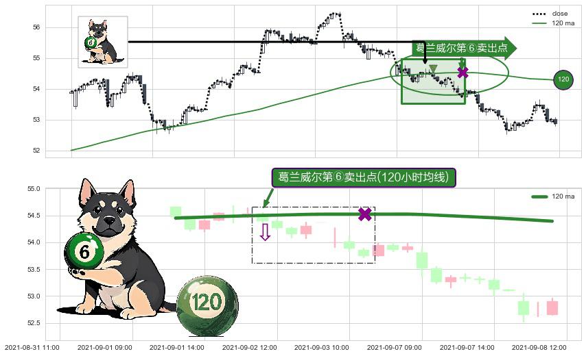 形态多维评估: ⚀ 2021-09-02 11:00:00-小时显现 葛兰威尔均线 120小时均线 第⑥卖出点 走势反转见顶信号,后市看跌,卖出信号