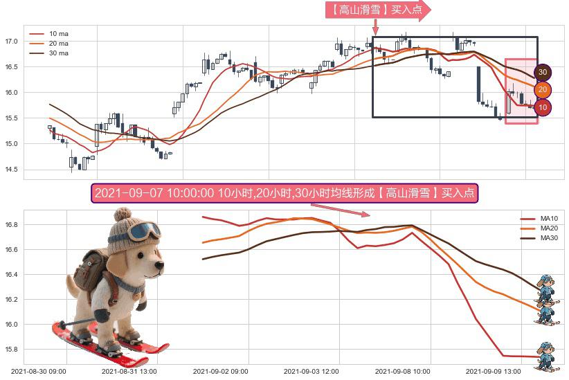 形态多维评估: ⚀ 2021-09-01 11:00:00小时-2021-09-09 15:00:00小时显现 10小时-20小时-30小时均线 【高山滑雪】买入点 看多信号,后市看涨,买入