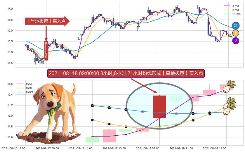 形态多维评估: ⚀ 2021-08-18 09:00:00小时显现 3小时-8小时-21小时均线 【旱地拔葱】买入点 看多信号,后市看涨,买入