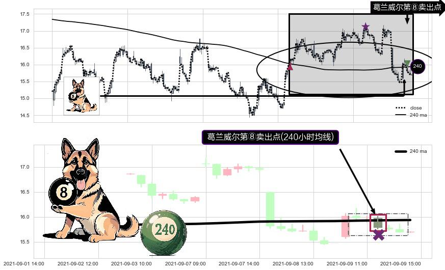 形态多维评估: ⚀ 2021-09-09 12:00:00-小时显现 葛兰威尔均线 240小时均线 第⑧卖出点 下降趋势的中继信号,后市看跌,卖出信号
