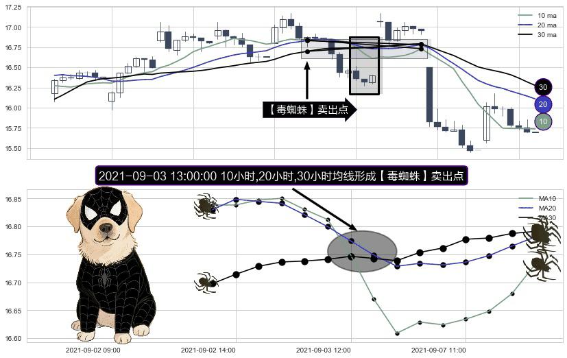 形态多维评估: ⚀ 2021-09-03 13:00:00小时显现 10小时-20小时-30小时均线 【毒蜘蛛】卖出点 看空信号,后市看跌,卖出