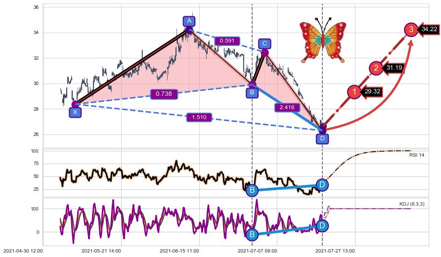 | 6 🅚:【高山滑雪】买入点 ➕ 📡:谐波蝴蝶已到达d点:猜想c下行到达d点后报复性拉升上涨(均值回复) ☞ 看多信号 ⇥ 【均线】交织【图形】⇥ 综合量化分数: 52 | > |