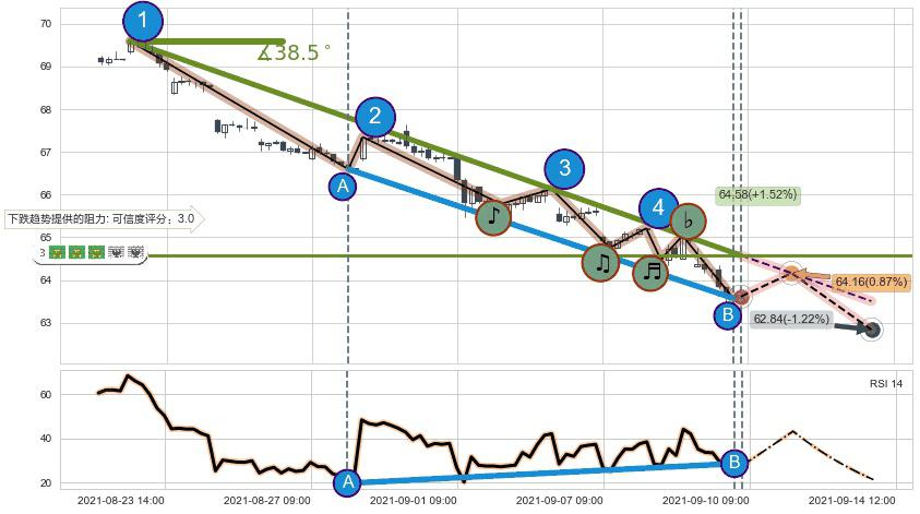 ♘ 在最后的下跌阶段2021-08-23 09:00至2021-09-09 15:00,存在 持续未破位的阻力位 ,阻力价格64.58,可信任强度76.36%,其距离最后价格63.61相差 +1.52%