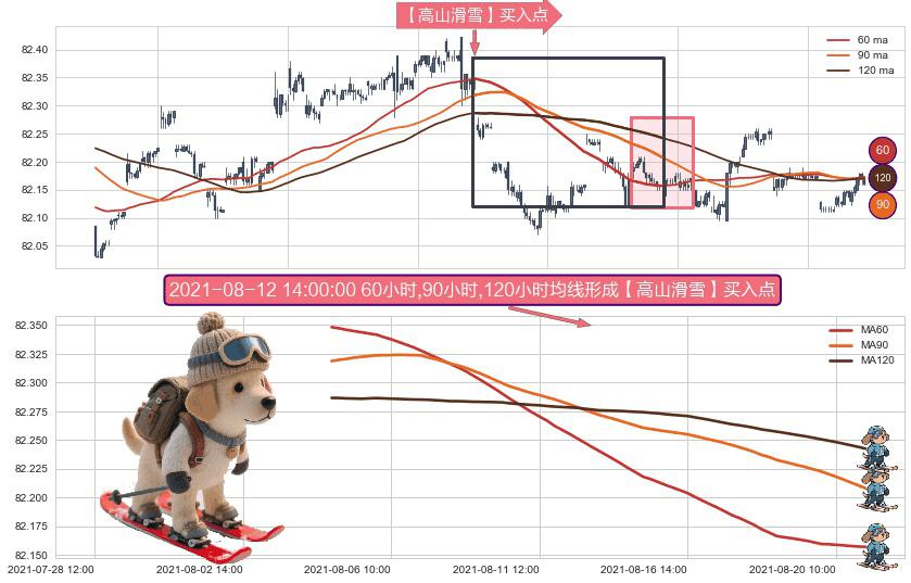 形态多维评估: ⚀ 2021-08-04 14:00:00小时-2021-08-20 14:00:00小时显现 60小时-90小时-120小时均线 【高山滑雪】买入点 看多信号,后市看涨,买入