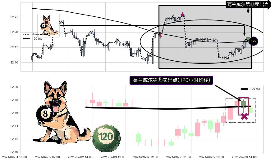 形态多维评估: ⚀ 2021-09-09 13:00:00-小时显现 葛兰威尔均线 120小时均线 第⑧卖出点 下降趋势的中继信号,后市看跌,卖出信号