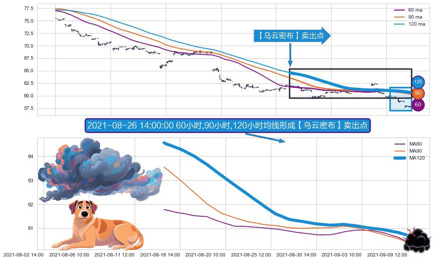 形态多维评估: ⚀ 2021-08-13 13:00:00小时-2021-09-09 14:00:00小时显现 60小时-90小时-120小时均线 【乌云密布】卖出点 看空信号,后市看跌,卖出
