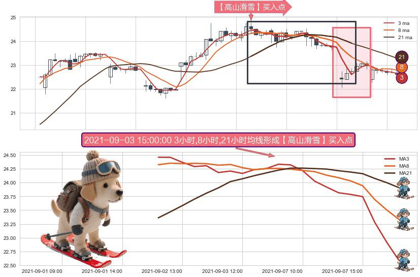 形态多维评估: ⚀ 2021-09-02 11:00:00小时-2021-09-08 11:00:00小时显现 3小时-8小时-21小时均线 【高山滑雪】买入点 看多信号,后市看涨,买入