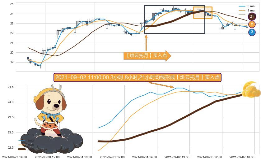 形态多维评估: ⚀ 2021-08-31 11:00:00小时-2021-09-07 09:00:00小时显现 3小时-8小时-21小时均线 【烘云托月】买入点 看多信号,后市看涨,买入