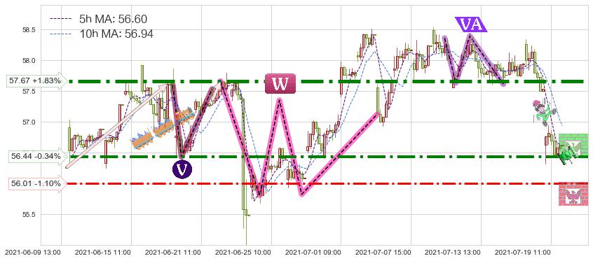 ♞ 5小时均线:56.60,10小时均线:56.94→ 快线<慢线