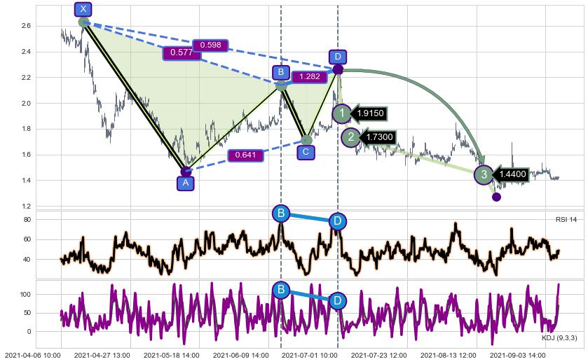 ➢ 谐波价格D点比B点高 ⤴,【KDJ】指标D点比B点低 ⤵️