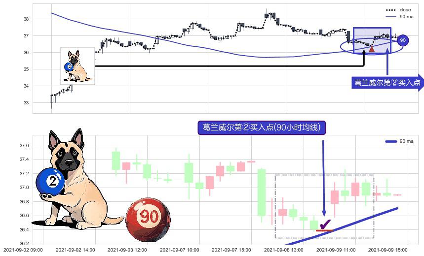 形态多维评估: ⚀ 2021-09-08 15:00:00-小时显现 葛兰威尔均线 90小时均线 第②买入点 上升趋势的中继信号,后市看涨,买进信号