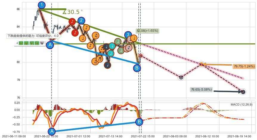 ➣ 预测:2021-08-06 12:00,【试探阻力】稳定目前下跌趋势的前提下,预测价格:79.75