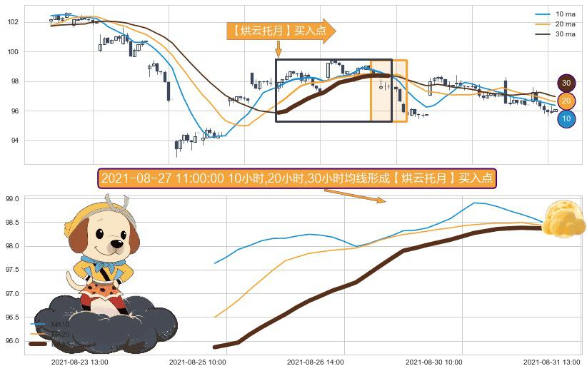 形态多维评估: ⚀ 2021-08-25 09:00:00小时-2021-08-31 11:00:00小时显现 10小时-20小时-30小时均线 【烘云托月】买入点 看多信号,后市看涨,买入