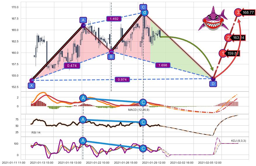 ➣ 未完成【鲨鱼】形态起点X: 01-11:15, 已到达C点: 01-27:11, 预测最终D点: 02-04:14, 共124交易小时