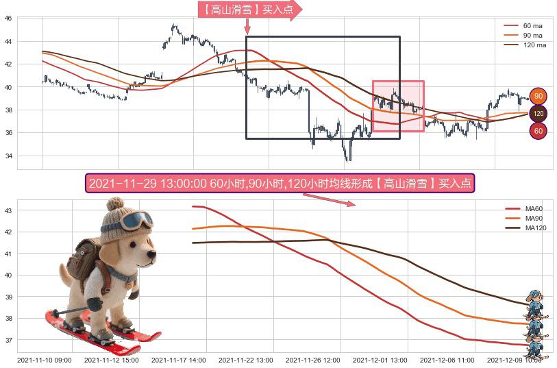 形态多维评估: ⚀ 2021-11-17 10:00:00小时-2021-12-08 13:00:00小时显现 60小时-90小时-120小时均线 【高山滑雪】买入点 看多信号,后市看涨,买入