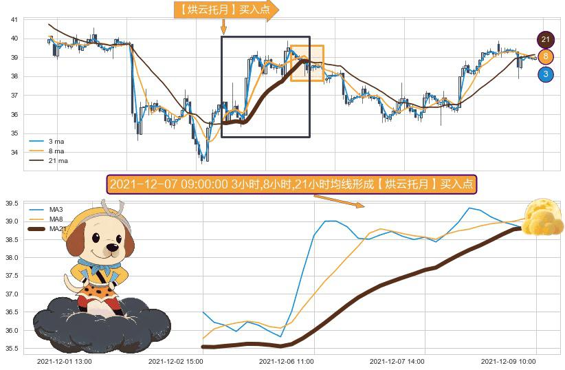 形态多维评估: ⚀ 2021-12-02 15:00:00小时-2021-12-09 10:00:00小时显现 3小时-8小时-21小时均线 【烘云托月】买入点 看多信号,后市看涨,买入