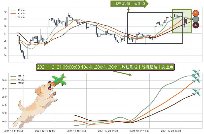 形态多维评估: ⚀ 2021-12-16 11:00:00小时-2021-12-23 14:00:00小时显现 10小时-20小时-30小时均线 【战机起航】卖出点 看空信号,后市看跌,卖出
