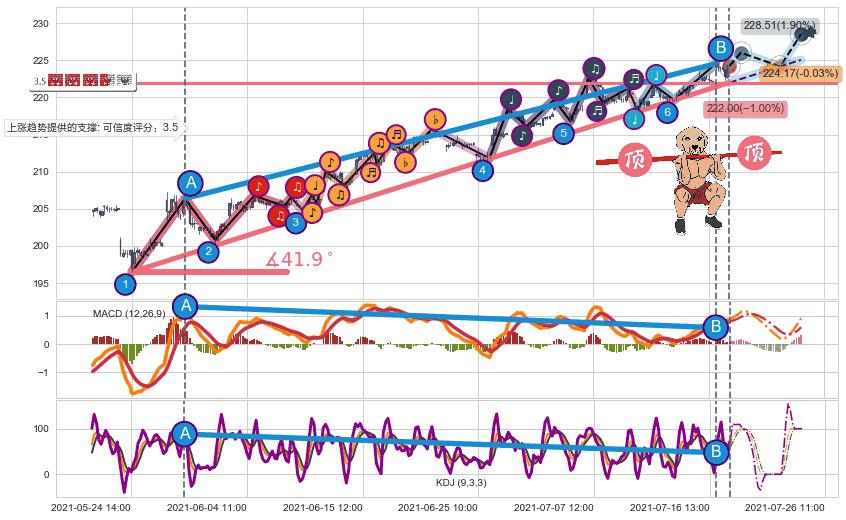 🍖 长线趋势跟踪组合短线均值回复[强支撑信号]2021-05-24 14:00-2021-07-19 15:00上升趋势依然成立(上涨趋势跟踪依然可行),短线价格略微下行回调(均值回复猜想),即将接近趋势提供的未破位的支撑价格:222.00。