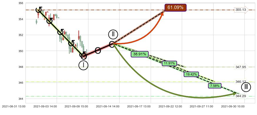 ➢ 循环浪继续向下【最高】位置(09-22:14, 347.95),匹配聚类样本比例30.61%, 可能性概率11.91%
