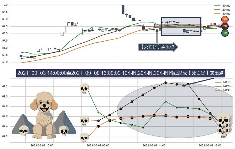 形态多维评估: ⚀ 2021-09-07 09:00:00-小时至2021-09-08 13:00:00-小时显现 10小时-20小时-30小时均线 【死亡谷】卖出点 看空信号,后市看跌,卖出