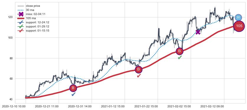 上涨趋势06-25 15:00-07-15 11:00,均线105确认关键支撑1处