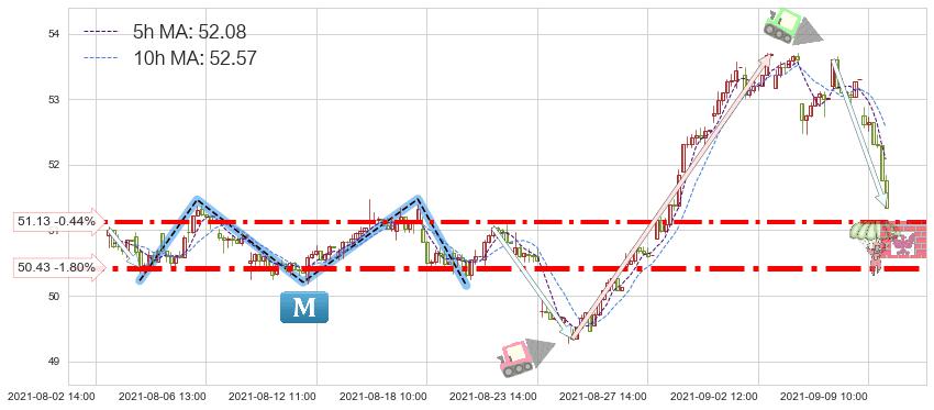 ♘ 支撑价格位50.43,可信任强度91.57%,距离最后交易2021-09-09 14:00形成的收盘价格51.35相差 -1.80%