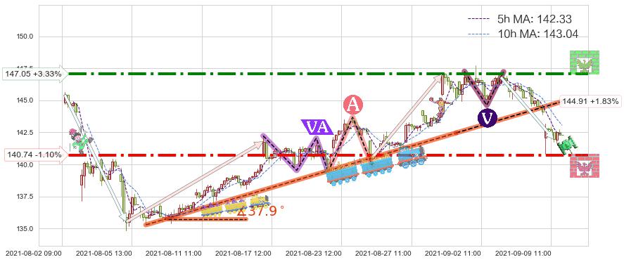 ♞ 5小时均线:142.33,10小时均线:143.04→ 快线<慢线