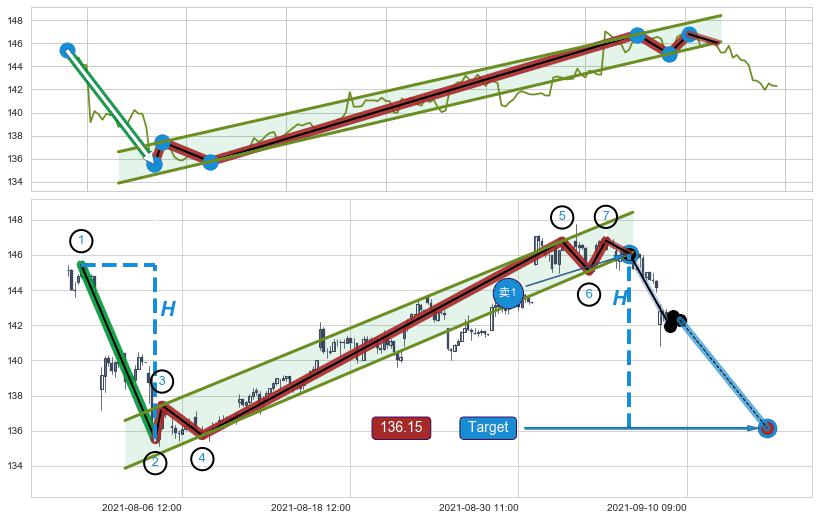 ➢ 最后的上涨趋势2021-08-06 11:00至2021-08-31 14:00:存在破位迹象,后续小调整或者反转下跌