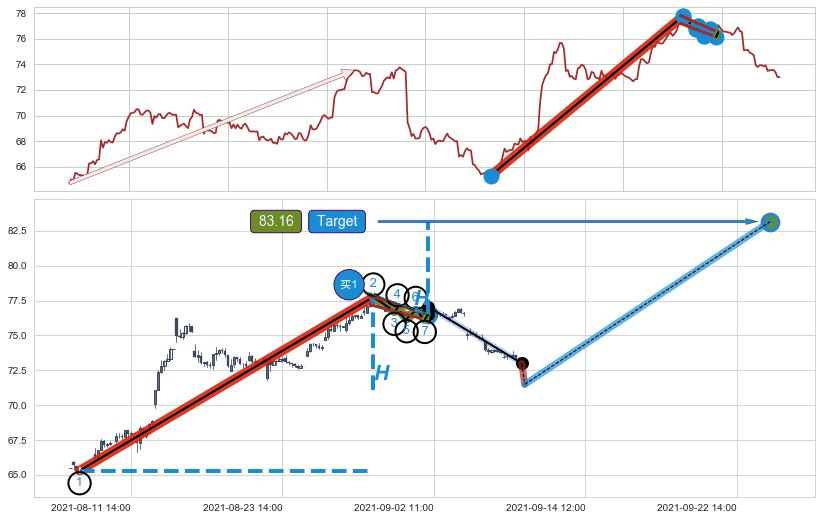 从2021-06-22 12:00至2021-07-23 13:00,共包含145个小时,阶段股价上涨12.98%,阶段股价变动位移路程比: 1 : 3